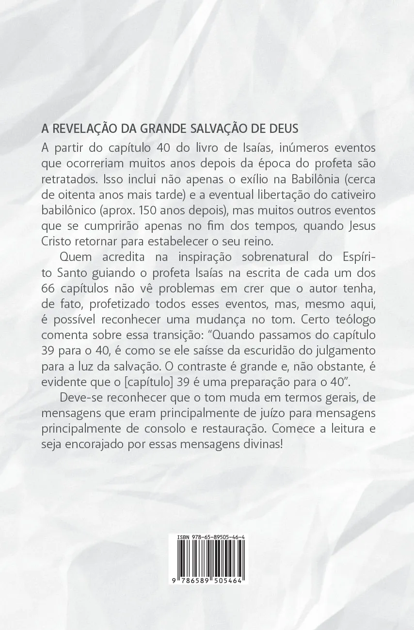 Este comentário expositivo apresenta ao leitor arevelação da grande salvação de Deus nos capítulos 40 a 66 do livro do profeta Isaías, especialmente pelo Servo de Deus, Jesus Cristo